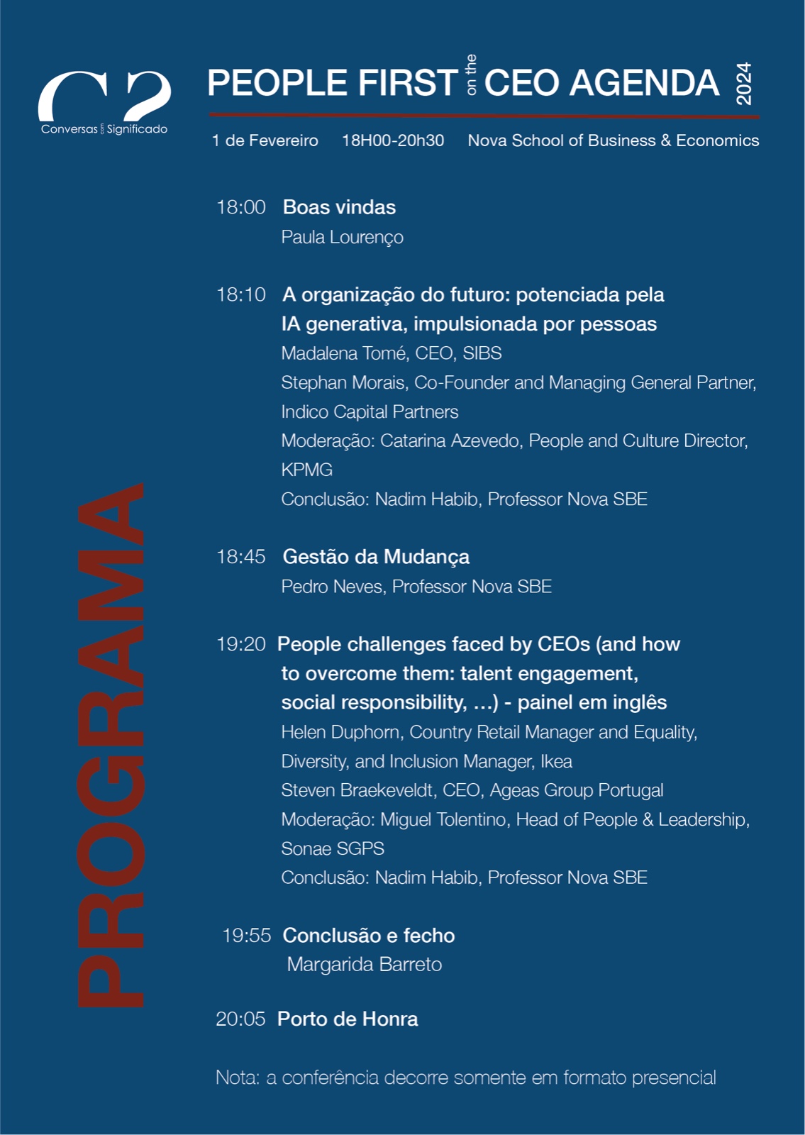 No dia 1 de Fevereiro, a partir das 18h00 acontece na Nova SBE a conferência “People First on the CEO agenda 2024”, das Conversas com Significado.