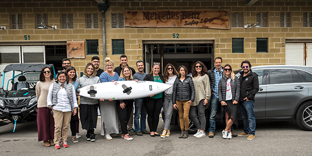 Desde 2012 que a Mercedes-Benz tem vindo a desenvolver projectos em torno das ondas gigantes da Praia do Norte e do surfista Garrett McNamara, tendo estabelecido no Porto de Abrigo da Nazaré uma sede para o surf – o Mercedes–Benz Lounge & Garage –, que acolhe os convidados da marca, jornalistas e atletas. Porque «o sucesso das acções que a marca ali tem vindo a desenvolver resulta do envolvimento e empenho dos colaboradores responsáveis pela sua organização, surgiu a ideia de possibilitar uma experiência única também aos colaboradores. Foi um passo pequeno e natural, com resultados evidentes em termos de motivação e sentido de pertença à marca», garante Helena Morgado, directora de Recursos Humanos da Mercedes-Benz Portugal. «A possibilidade de contactar com o embaixador da marca Garrett McNamara e a sua equipa é um factor de diferenciação.»