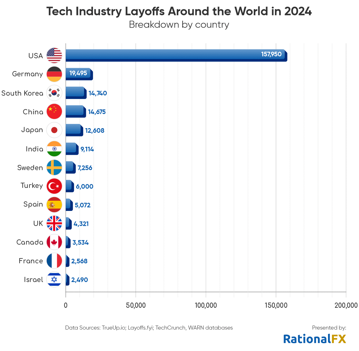 Entre 1 de Janeiro e 31 de Dezembro de 2024, 267 empresas tecnológicas americanas despediram um total de 157.950 funcionários. Isto representa mais de metade (56,2%) de todos os despedimentos no sector tecnológico no mundo, que totalizam 280.991. Grandes economias como a China, a Índia, a Alemanha, a Coreia do Sul e o Japão também perderam um número significativo de empregos na indústria tecnológica.