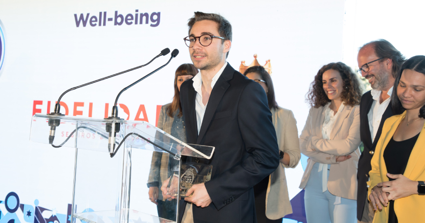 Francisco Santos, da área de Cultura e Envolvimento Organizacional, que integra a direcção de Pessoas e Organização, e também o responsável pelo Programa de Well-being no Grupo Fidelidade, recebeu o prémio das mãos de Manuel Lopes da Costa, sócio do Multipublicações Media Group.