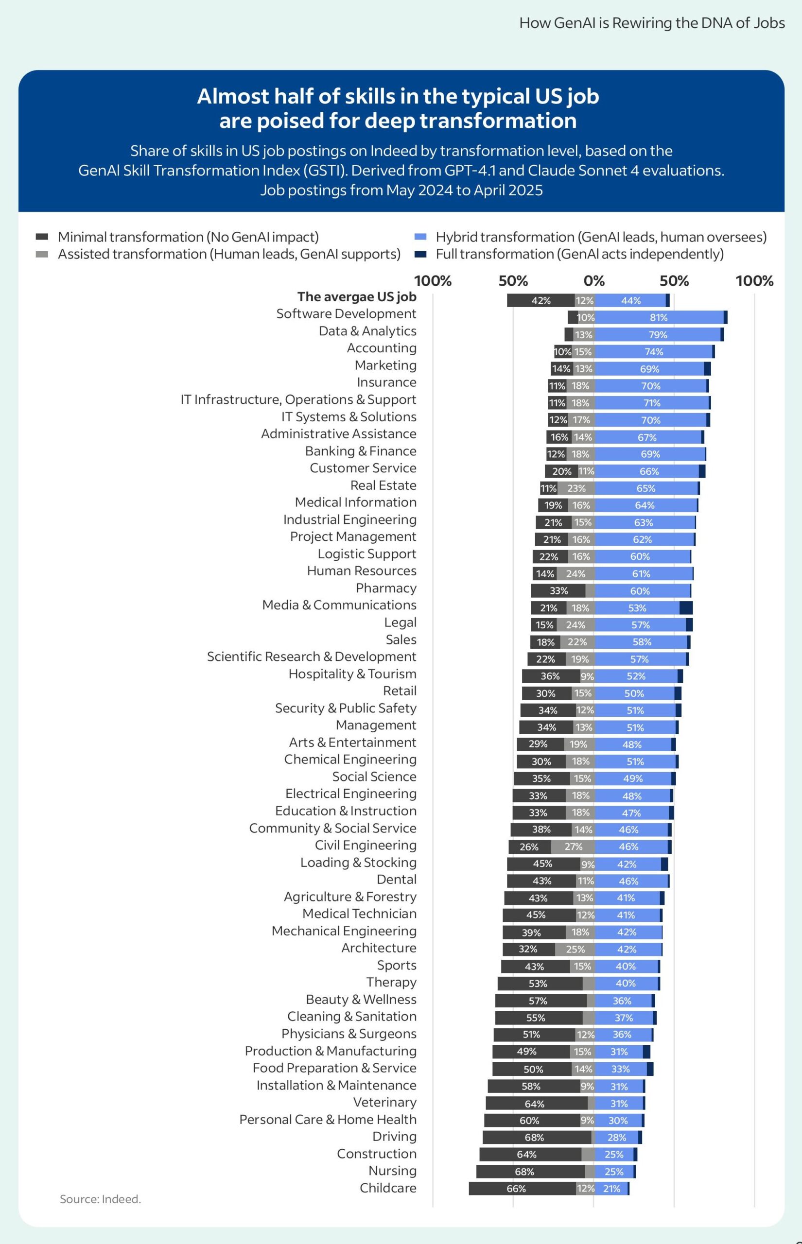 O GenAI Skill Transformation Index da Indeed mede o quanto a IA generativa pode mudar a forma como as diferentes competências ou empregos são realizados. Em vez de medir se esta tecnologia irá substituir totalmente os trabalhadores humanos, examina como as competências podem ser aplicadas no futuro e como pode evoluir o envolvimento humano com estas competências e tarefas.