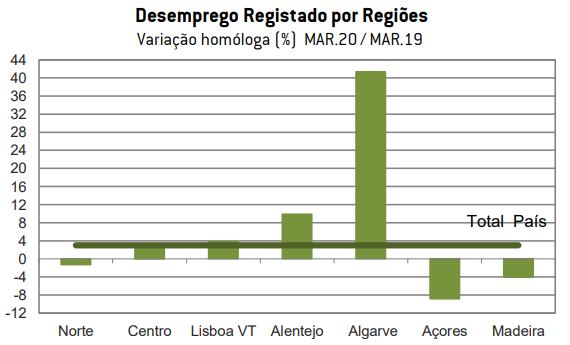 Segundo o IEFP, existiam, em Março, 343.761 (70% de um total de 485.190 pedidos de emprego) desempregados registados no IEFP, um acréscimo de 8,9% face a Fevereiro e mais 3% em comparação com o período homólogo. «Para o aumento do desemprego registado, face ao mês homólogo de 2019, contribuíram todos os grupos do ficheiro de desempregados, com destaque para os homens, os adultos com idades iguais ou superiores a 25 anos, os inscritos há menos de um ano, os que procuravam novo emprego e os que possuem como habilitação escolar o secundário», refere o organismo.