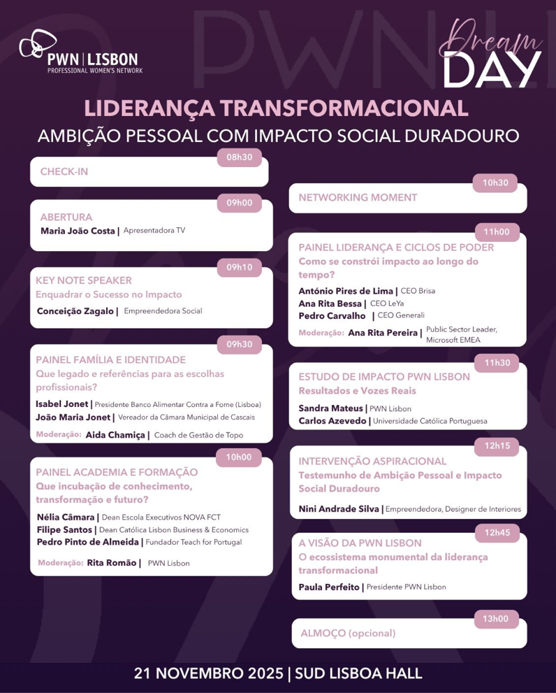 A Professional Women’s Network Lisbon (PWN Lisbon) promove mais um Dream Day, para reflectir sobre a Liderança Transformacional – Ambição Pessoal com Impacto Social. Este ano será também revelado o resultado do Estudo de Impacto da PWN Lisbon. A Human Resources volta a ser Media partner do evento.
