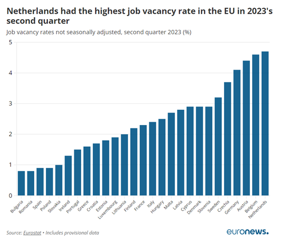 Entre os Estados-Membros da UE com dados disponíveis no Eurostat, os Países Baixos registam a taxa de vagas de emprego mais elevada, com 4,7% do total de postos de trabalho ainda por preencher. A Bulgária e a Roménia, por outro lado, registaram apenas uma taxa de vagas de emprego de 0,8% no mesmo trimestre. Portugal ocupa o 21º. lugar com uma taxa de 1,5%.