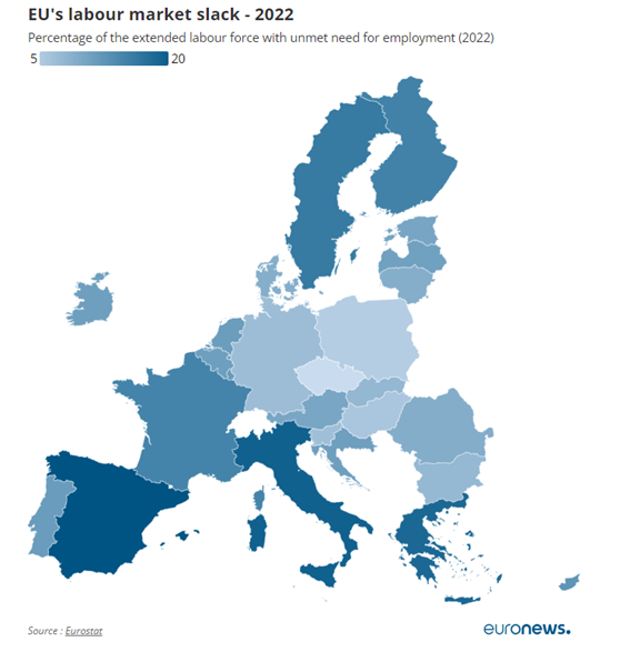 Isto significa que mais de 1 em cada 8 pessoas na União Europeia está exposta à “folga” do mercado de trabalho, definida pela Organização Internacional do Trabalho como “a diferença entre o volume de trabalho desejado pelos trabalhadores e o volume de trabalho remunerado disponível.”