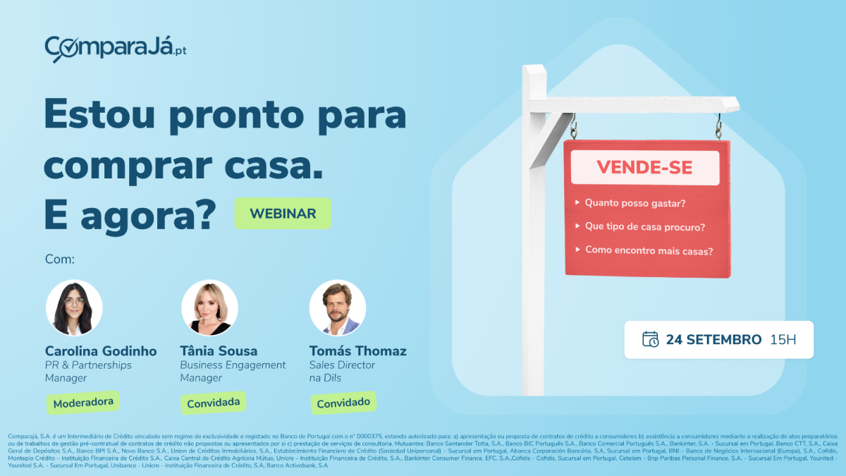 O ComparaJá vai realizar amanhã, dia 24 de Setembro, às 15h00, o webinar gratuito “Estou pronto para comprar casa. E agora?”, destinado a todos os que estão preparados para dar o passo da compra de casa, mas ainda têm dúvidas sobre como avançar.